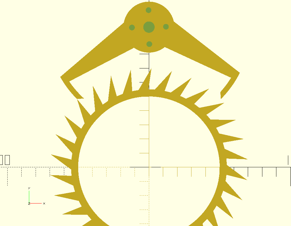 The CAD obviously includes detail elided here: the armature outline and hub of the escapement wheel.